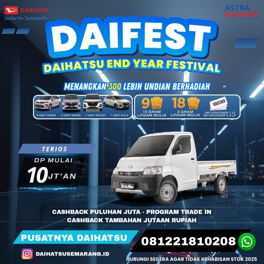 Manfaatkan promo Daihatsu Gran Max Pickup di Semarang bulan ini! Tersedia paket kredit ringan dengan DP mulai dari 10 jutaan dan cicilan yang fleksibel. Jangan lewatkan kesempatan untuk mendapatkan kendaraan niaga terbaik dengan harga bersaing.